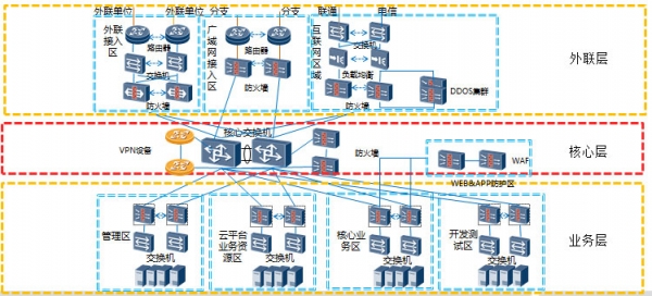 由于外联网接入区属于企业外部用户接入的区域,从网络信任关系上讲,安全等级与DMZ相同,都属于非可信网络,不能直接与内部数据中心连接。访问权限应限制在本区域内部及DMZ区域,内网访问应严格控制。