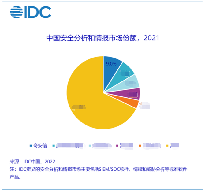 近日,国际权威咨询机构IDC发布了《2021年下半年中国IT安全软件市场跟踪报告》(以下简称《报告》)。《报告》显示,2021年全年中国IT安全软件市场厂商整体收入为34.2亿美元(约合220.4亿元人民币),较2020年增长31.7%,规模和增速均创历史新高。在安全分析和情报领域,奇安信以9%的市场份额,连续两年夺得该细分领域第一名。